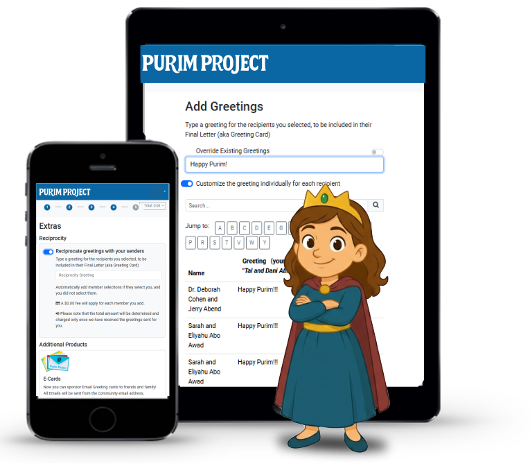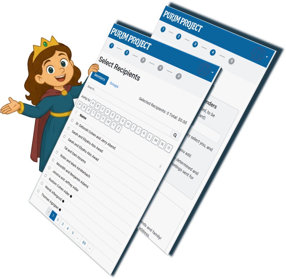 Purim Project is web-based software and a comprehensive service used by temples and schools to run a unique community-engaging fundraising project. Purim fundraising projects are a great opportunity to raise funds and provide a much appreciated service to members. The organization (e.g. temple or school) sends a member list to each and every member of the organization. Each member is asked to select members from the list that they wish to send their Happy Purim wishes to. The organization receives a donation for each member selected. The list is then automatically compiled to generate unique letters to each member family, wishing them a Happy Purim and indicating in the letter which families chose to send their blessings. Typically the organization will prepare Mishloach Manoד baskets, one for each family, to go along with the Happy Purim letters.